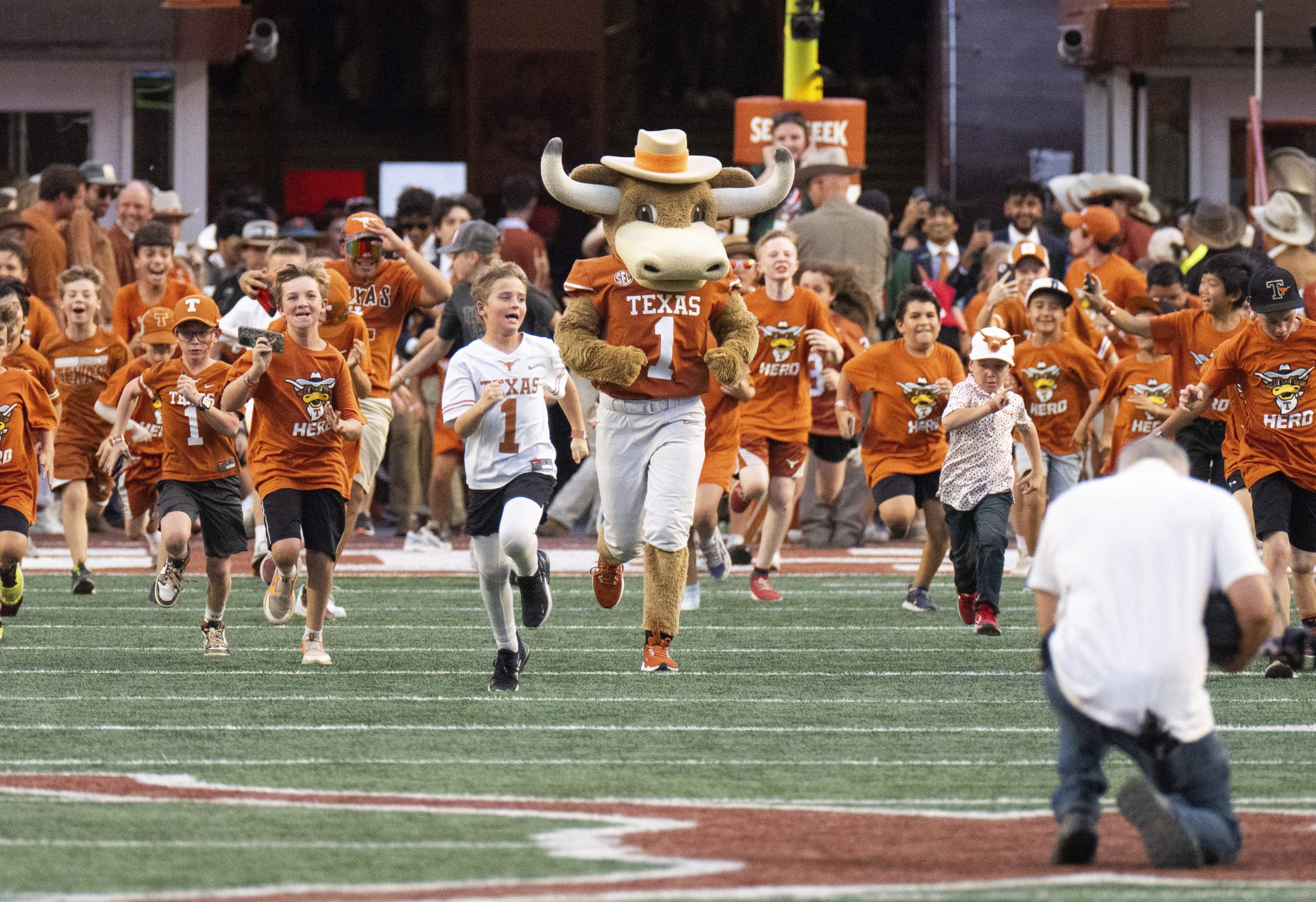 Texas Mascot “BEVO” leads young fans onto the field before a game last year in Austin. The Longhorns this year welcome rival Texas A&M. (AP Photo/Michael Thomas)