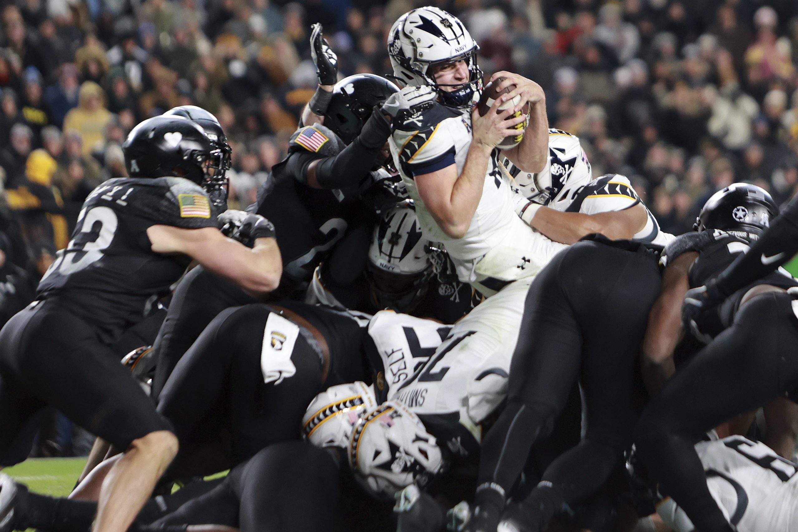 Navy quarterback Blake Horvath dives over the goal line to score a touchdown against Army during last year’s rivalry matchup. (AP Photo/Daniel Kucin Jr.)