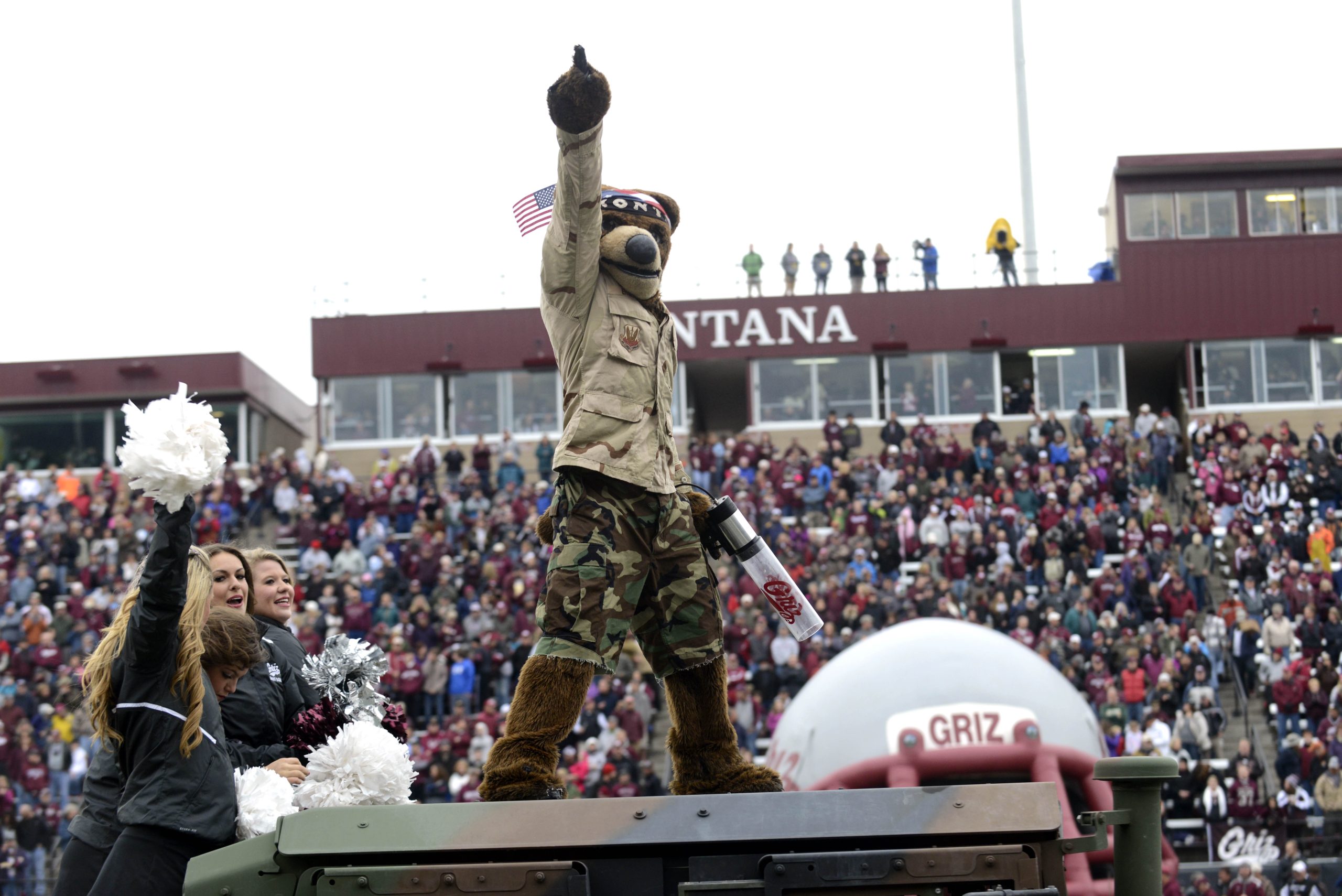Montana mascot Monte entertains the crowd from the roof of a vehicle driven around Washington-Grizzly Stadium before a game in Missoula. (AP Photo/Lido Vizzutti)