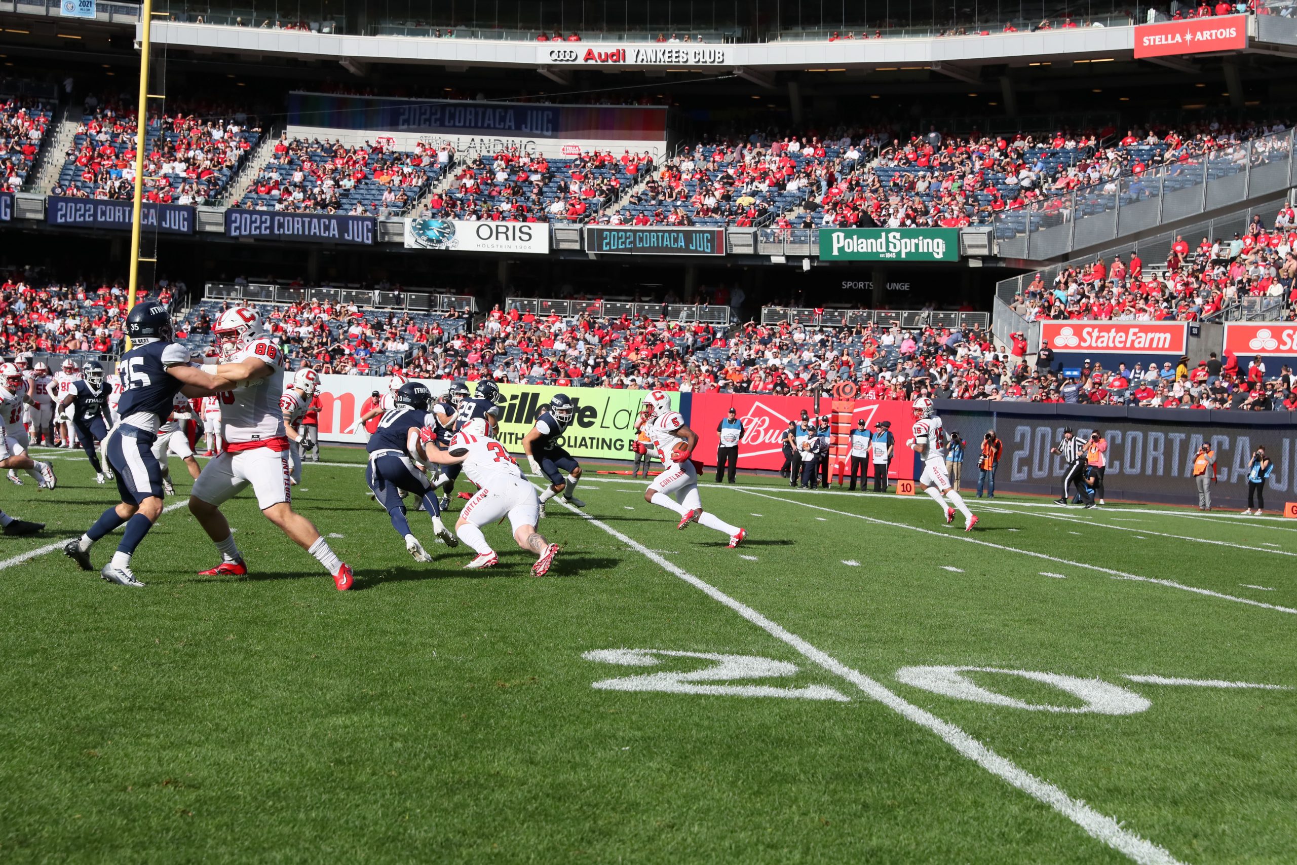 Division III rivals SUNY Cortland and Ithaca College raced off in the 2022 Cortaca Juge at Yankee Stadium in front of more than 40,000 fans. Courtesy Darl Zehr Photography