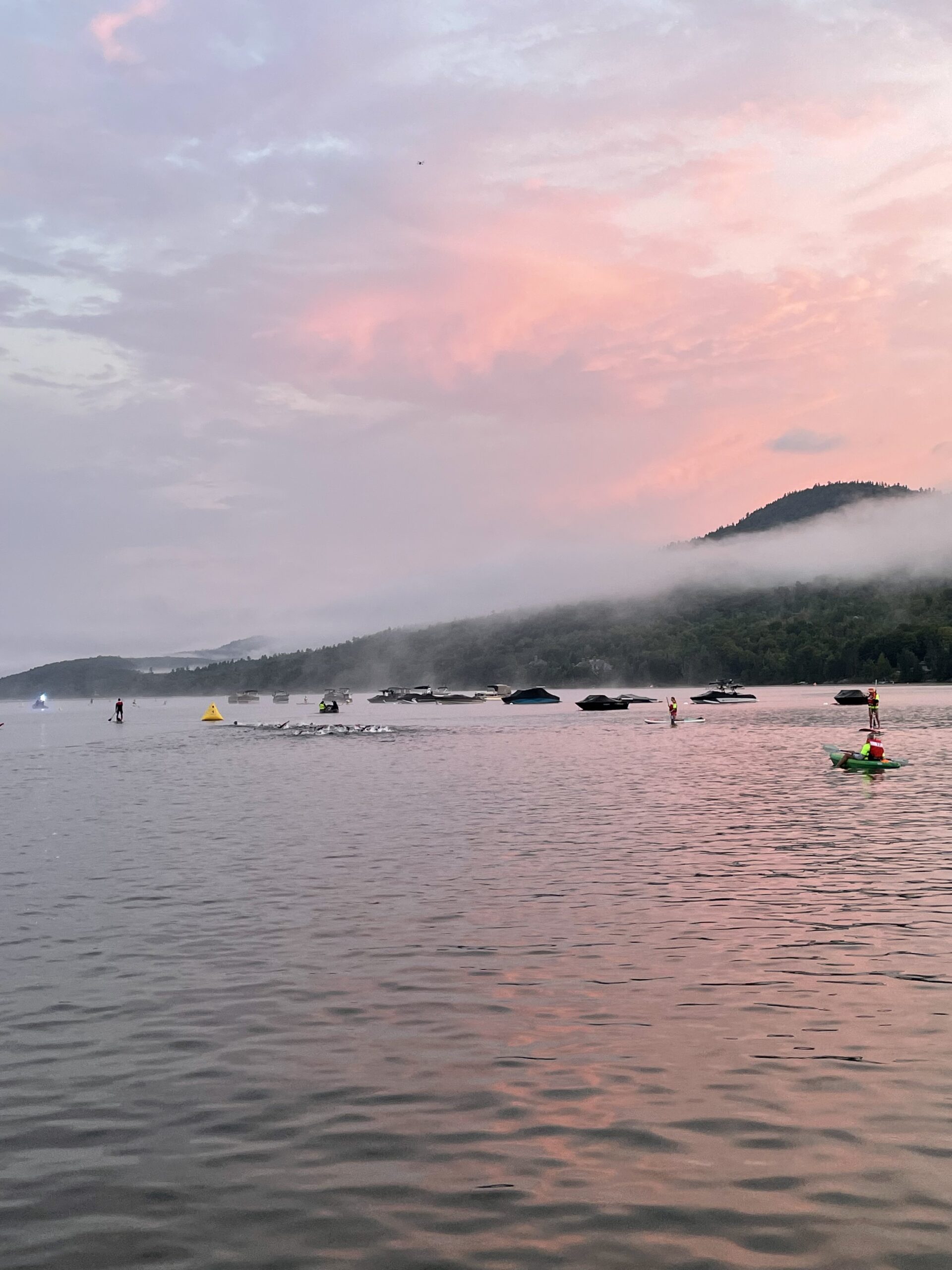 And now … the event. The full Ironman starts first with the professional female competition, followed by the other competitors. The race starts at Lac Tremblant, competitors racing into the water as the sunrise begins to paint the sky shades of pink with hundreds of fans gathered on the sandy shores. Competitors for both races — full and 70.3 — exit the lake at a different spot closer to the village, stripping off watersuits while scattering up the red carpet toward the transition area at the base of the village.