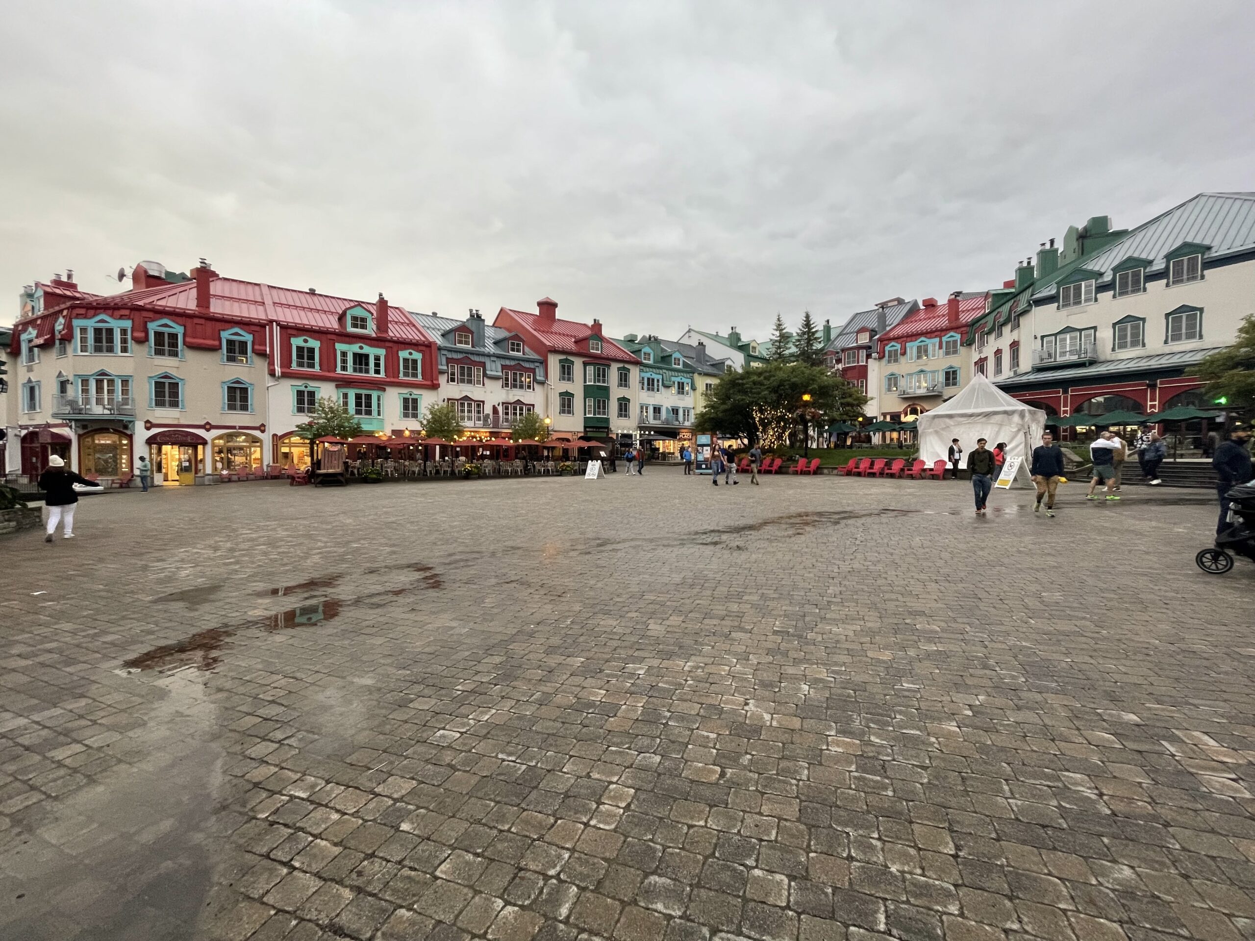 Leaving Montreal’s airport and heading north, what strikes you first is how progressively greener the scenery gets heading out of the city. On a busy Friday afternoon, it takes about two hours to reach the destination. Along the way, every building is a soft pastel with colored roofs straight out of a scrapbook of what you’d expect in a ski village of the Alps, with other lodging carved into the mountains in levels like staircases.