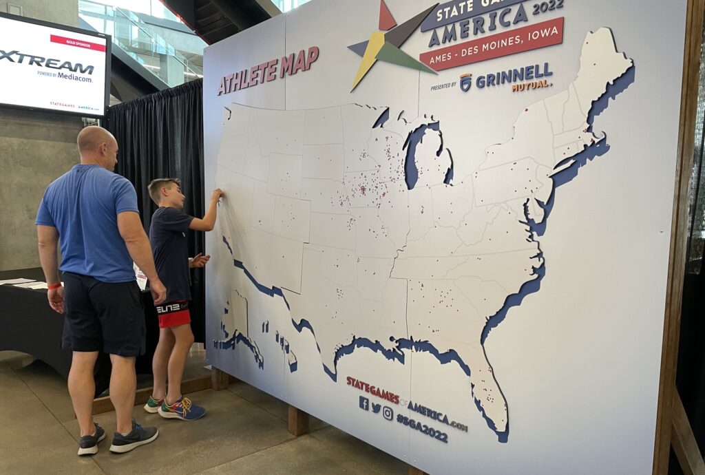 The State Games of America are held biannually and are open to those who medal at their individual state games. But all participants from local states can automatically qualify, making the Iowa contingent the largest in the competition. Still, the amount of out-of-state visitation could literally be marked on the map, where participants were able to pin their hometowns for all to see at the athlete registration area inside Jack Trice Stadium on the campus of Iowa State University.