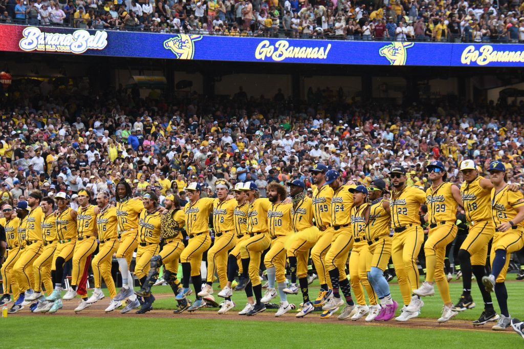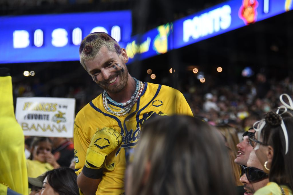 From a baseball perspective, Banana Ball is completely bonkers and yet completely works. There are no walks. On ball four, the batter can start running and keep running until all nine players on the other team touch the ball. If a fan catches a foul ball, the batter is out. And don’t even ask about what happens if the game is tied, but let’s just say the pitcher has to do a lot of running to get any ball that’s hit. As we’ve established, there’s no bunting, because bunting sucks. And no mound visits, because who other than the ones involved in that visit want to waste that time?